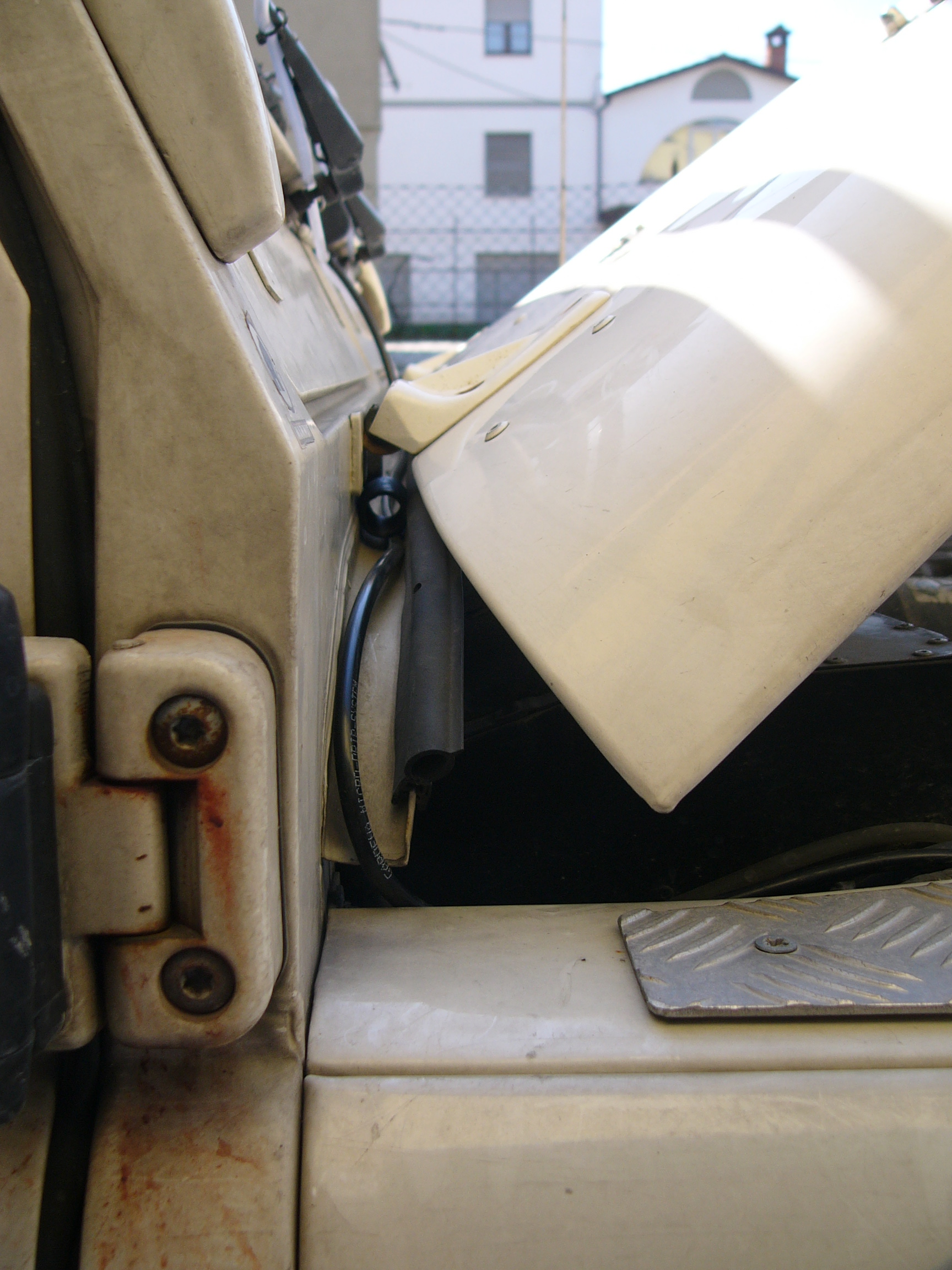 (in foto si vede anche un pezzo di corrugato incastrato sotto la cerniera del cofano per tenermi fermo il tubicino), si arriva fino al centro del parabrezza e lì si sale