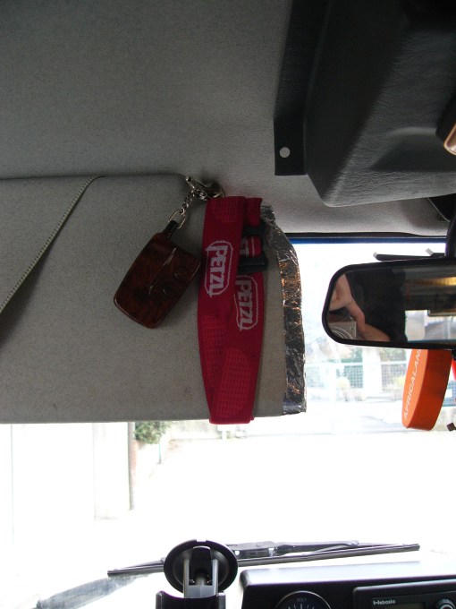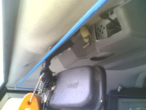 Per evitare di allungare il cavo dell’antenna ho preso un antennino da vetro, del tipo amplificato, e l’ho fissato davanti lo specchetto, poi ho fatto passare e ricablato i cavi di alimentazione dell’autoradio e delle casse e infine allungato l’alimentazione della plafoniera, ho preferito stare abbondante in quanto poi si possono ficcare sotto al rivestimento del tetto, i cavi passano dietro al cruscotto e salgono al tetto dal montante sinistro…questo montante è già occupato dai cavi della plafoniera e dal tubo dell’acqua dello spruzzino posteriore ma c’è posto comunque, se passavo dal montante destro avevo i cavi a spasso nel cassetto del cruscotto e non mi piaceva