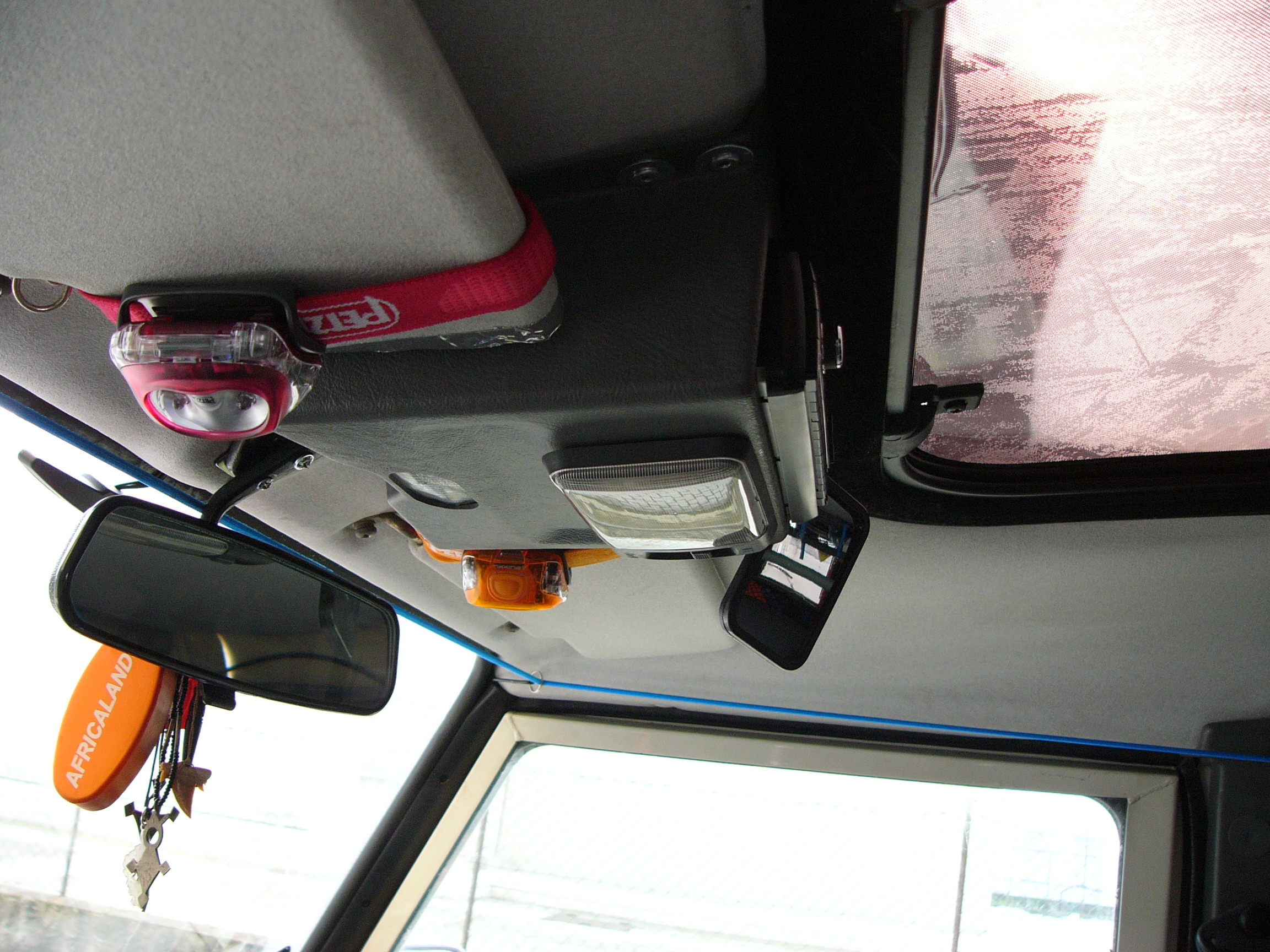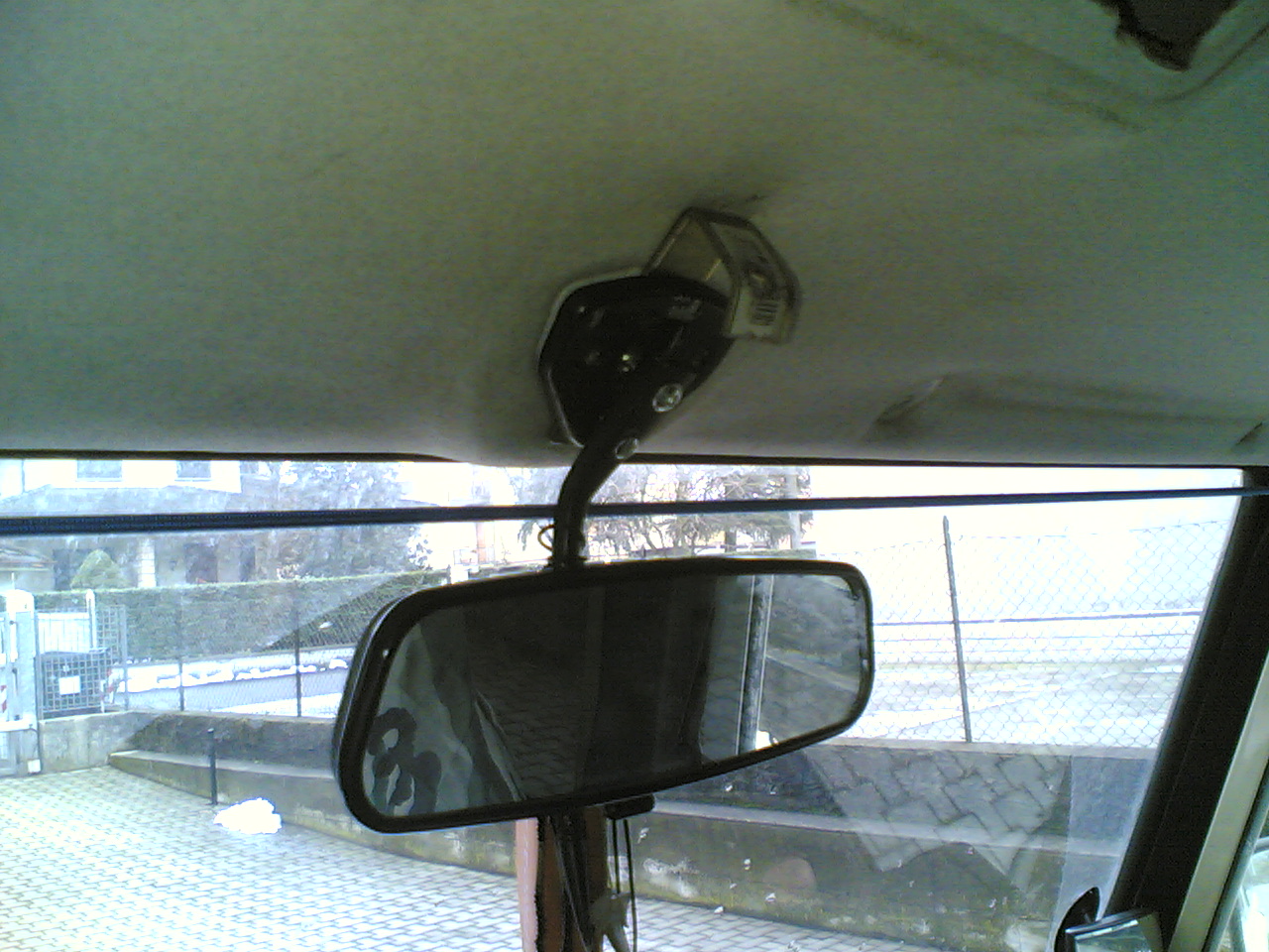Per evitare di allungare il cavo dell’antenna ho preso un antennino da vetro, del tipo amplificato, e l’ho fissato davanti lo specchetto, poi ho fatto passare e ricablato i cavi di alimentazione dell’autoradio e delle casse e infine allungato l’alimentazione della plafoniera, ho preferito stare abbondante in quanto poi si possono ficcare sotto al rivestimento del tetto, i cavi passano dietro al cruscotto e salgono al tetto dal montante sinistro…questo montante è già occupato dai cavi della plafoniera e dal tubo dell’acqua dello spruzzino posteriore ma c’è posto comunque, se passavo dal montante destro avevo i cavi a spasso nel cassetto del cruscotto e non mi piaceva