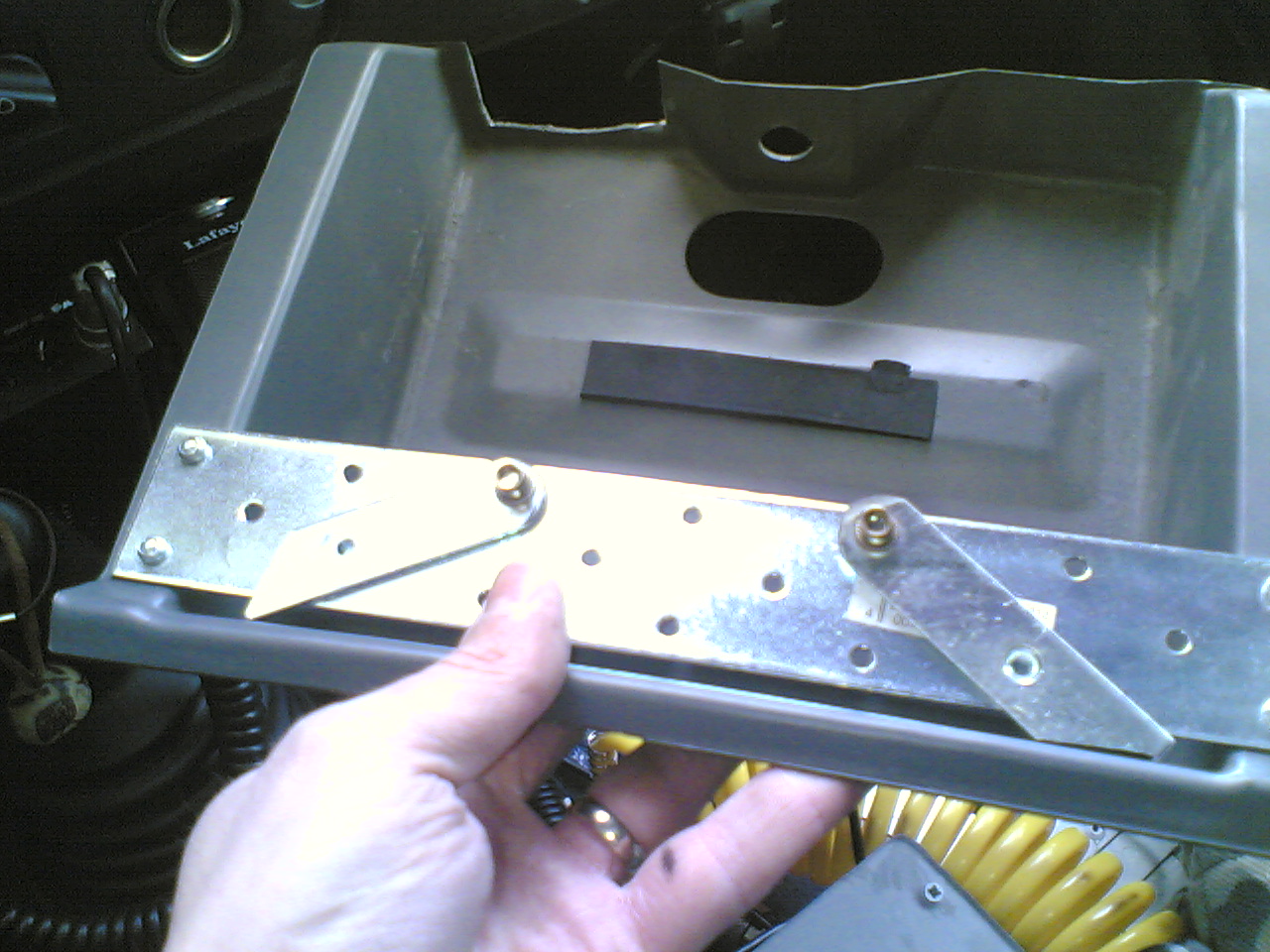 avevo già accorciato il gambo dello specchietto, è stato sufficiente eliminare la parte ad incastro e fissare il gambo direttamente contro il supporto fisso, una volta infilata la radio nella consolle la si fissa nel foro della squadretta tramite la vite standard nel retro dell’autoradio