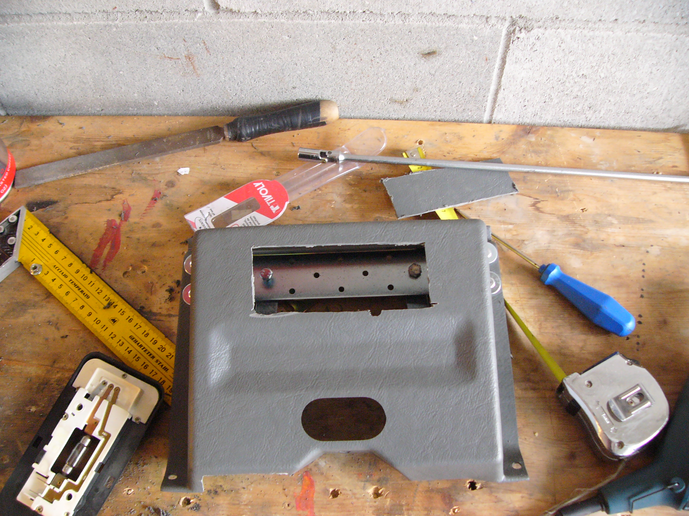 Anteriormente il labbro che solitamente si infila sotto la parte superiore del cruscotto si infila ora sotto la guarnizione del tettuccio, ad ulteriore sostegno ho rivettato un lamierino al portaradio che tramite due alette si fissa all’imperiale attraverso il foro della plafoniera