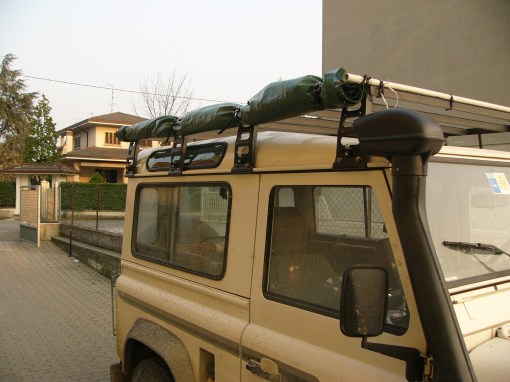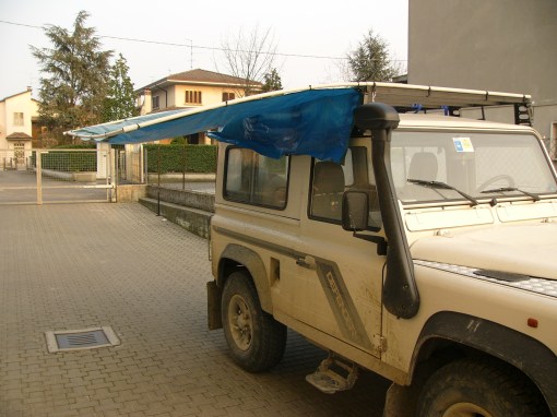 Ho tagliato in 2 pezzi da 1,40 il tubo da 25 e l’ho fissato sopra le traverse del portapacchi, gli ho infilato 2 pezzi da 1,50 del tubo da 20 che ho unito esternamente coi 2 mt avanzati unendoli coi due innesti a T, poi ho fissato il telo ai tubi ed al portapacchi con delle fascette di plastica.