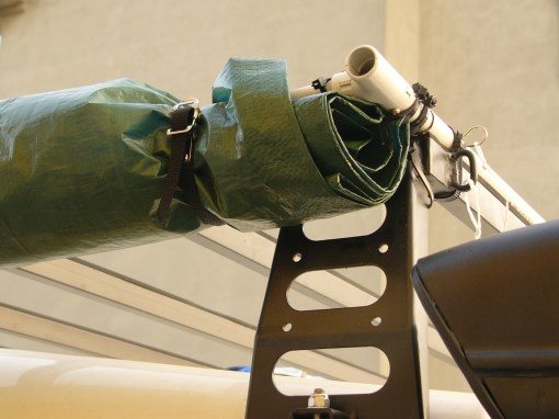 Ho poi rifilato il telo tenendolo più lungo dal lato del portapacchi per poterlo usare per coprire il tutto quando lo si chiude, per la chiusura ho usato 4 cinghietti da pedale di bicicletta: