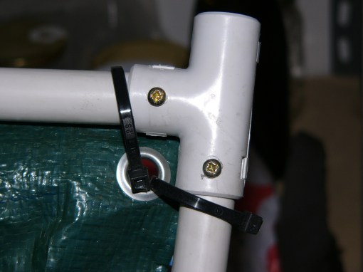 mi sono procurato del tubo per canaline elettriche, (3 mt diam. 25 e 3+2 mt diam.20), due raccordi a T del 20 ed un telo 3×2 con occhielli, spesa totale poco più di 10 euro.