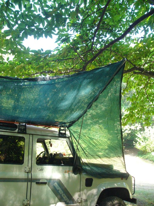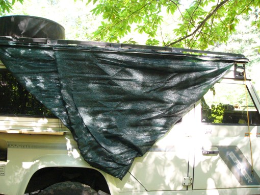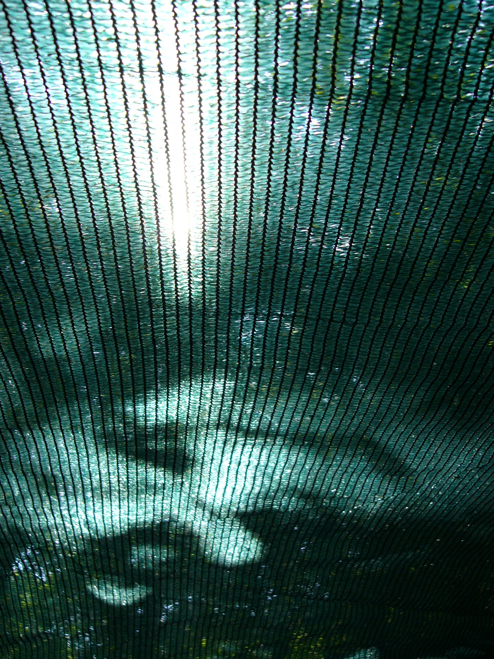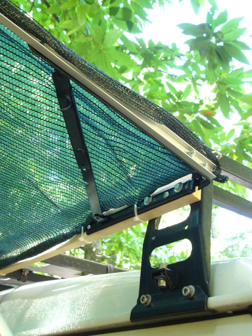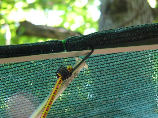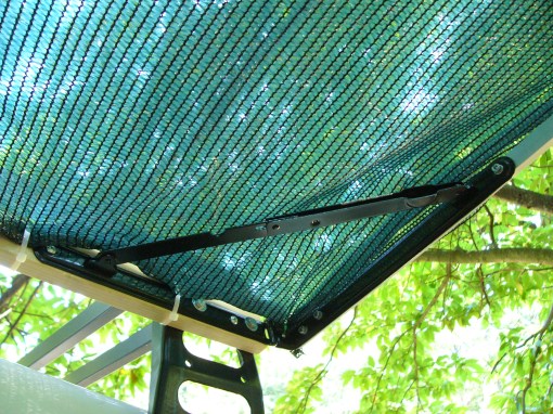 Sul telaio ho fissato della rete ombreggiante di quella che si usa per le siepi e gli orti, pesa poco, costa poco (il rotolo è largo 4mt e costa meno di 3 euro/mt), offre minore resistenza in caso di vento e per finire mi dà l’idea d’essere più fresca di una copertura in plastica “cieca” come quella utilizzata 4 anni fà.