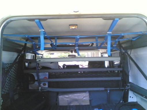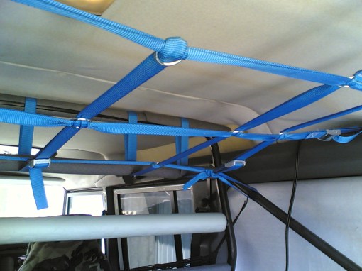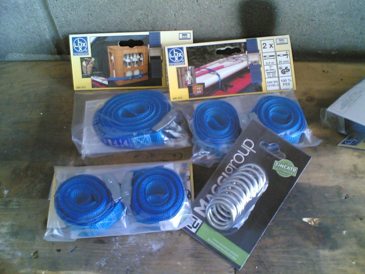 poi dei distanziatori M6 a cui ho avvitato dei ganci recuperati da dei Fisher, in questo modo sono riuscito a fissarli ai bulloni che tengono la parte superiore del tetto senza levare la copertura in plastica (e soprattutto la griglia separacarico)