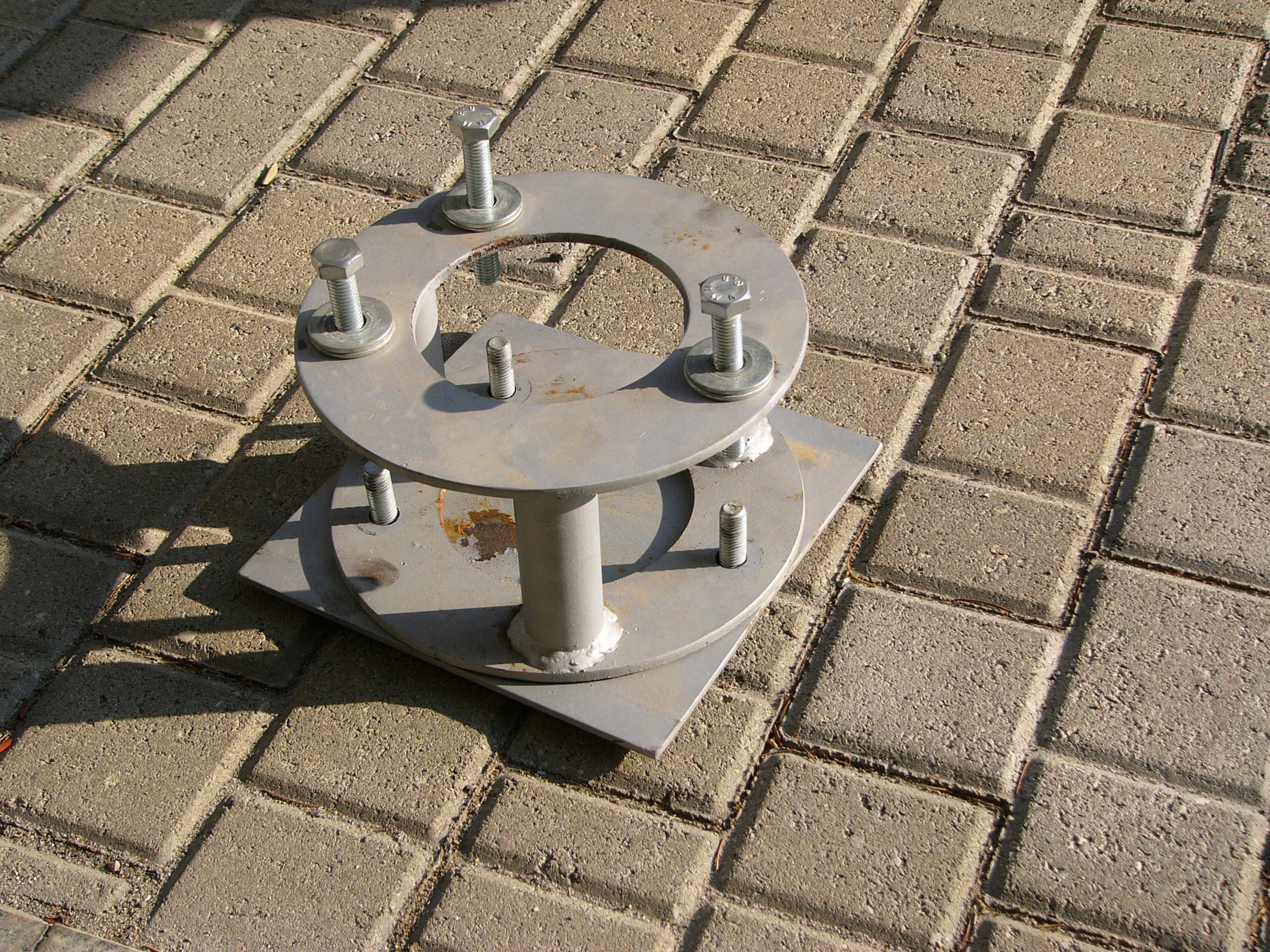 formato da due anelli distanziati da tre tubi (scusate non ho preso le misure ma sono facilmente rilevabili in fase d’opera). Dei due anelli quello sopra ha saldati tre dadi M10, a cui verrà fissata la gomma tramite i tre bulloni in foto, quello sotto ha tre fori che serviranno per fissare il tutto alla piastra vista prima.