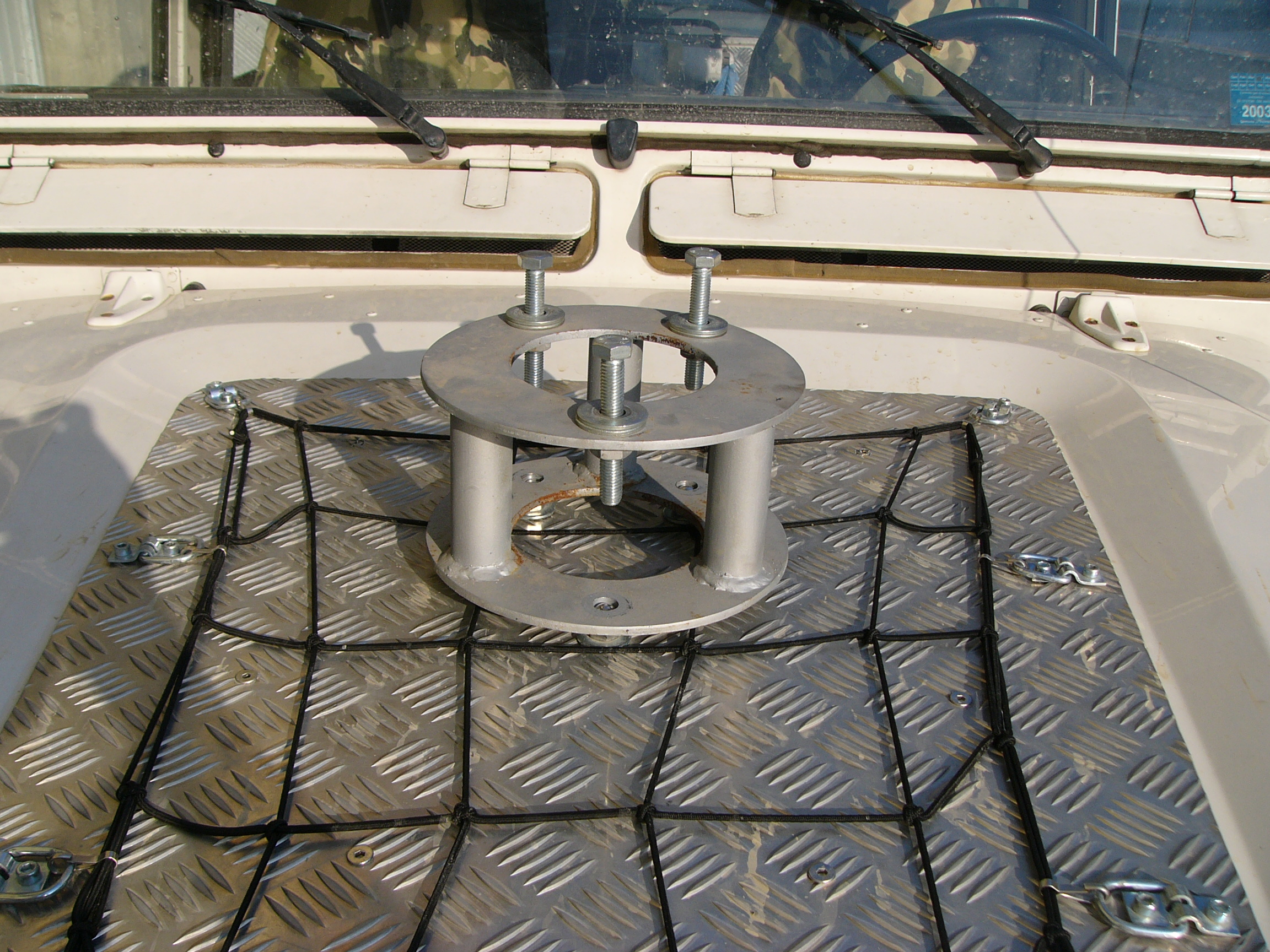 Tra il cofano e il supporto metto un disco di gomma spessa circa 3mm grande quanto la ruota in modo che il mandorlato non mi rovini la gomma. NB: la gomma di scorta NON appoggia sul supporto ma direttamente sul cofano, l’altezza del supporto è stata calcolata in modo che il cerchione non arrivi mai ad appoggiarcisi sopra, nemmeno in caso di gomma sgonfia, per questo servono dei bulloni lunghi, mi pare che io uso degli M10x100.