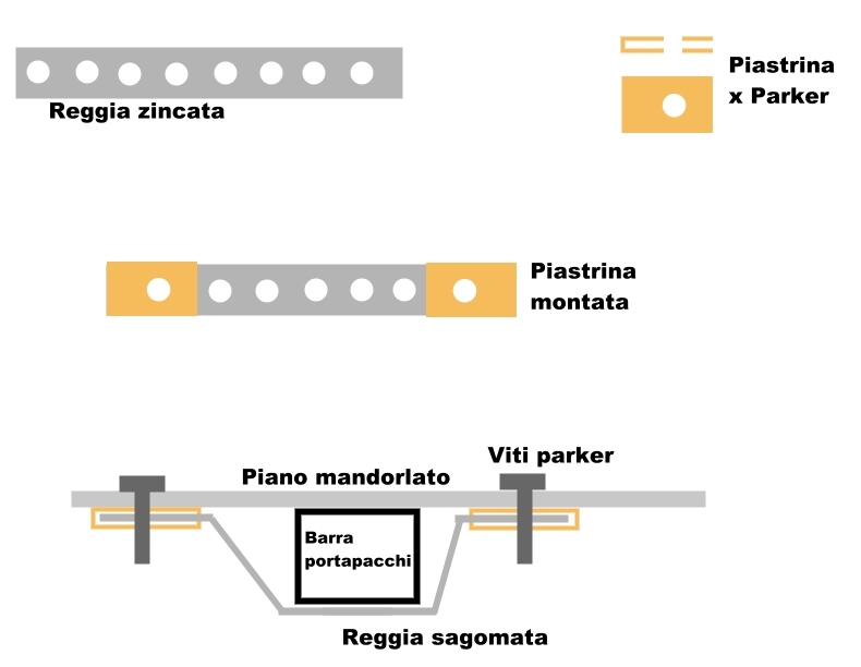 Ho optato per delle regge metalliche piegate ad omega con degli inserti per viti parker, secondo questo schema