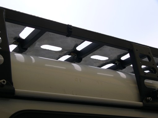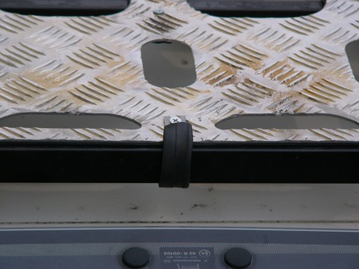 Nei due lati lunghi esterni, invece, ho utilizzato delle semplici fascette di plastica, quelle che m’erano state consigliate qui sopra, tanto servono solo a non far vibrare il piano ed essendo soggette ad usura strusciando contro i rami sono di facile e veloce sostituzione. Vista d’insieme finale del piano caplestabile fissato senza fare nemmeno un foro al portapacchi
