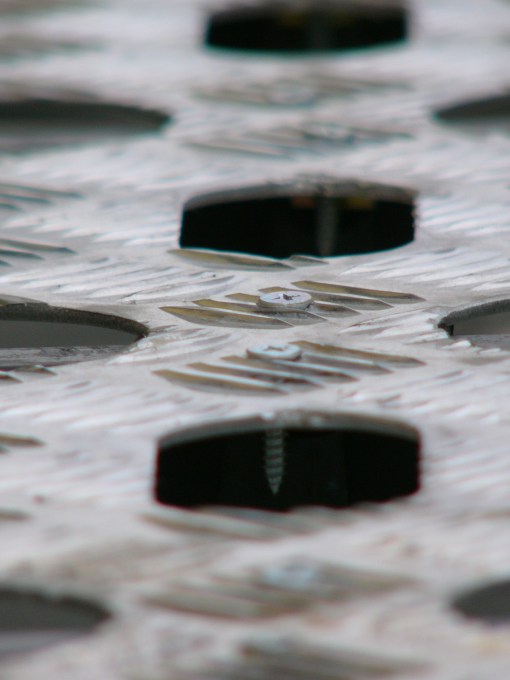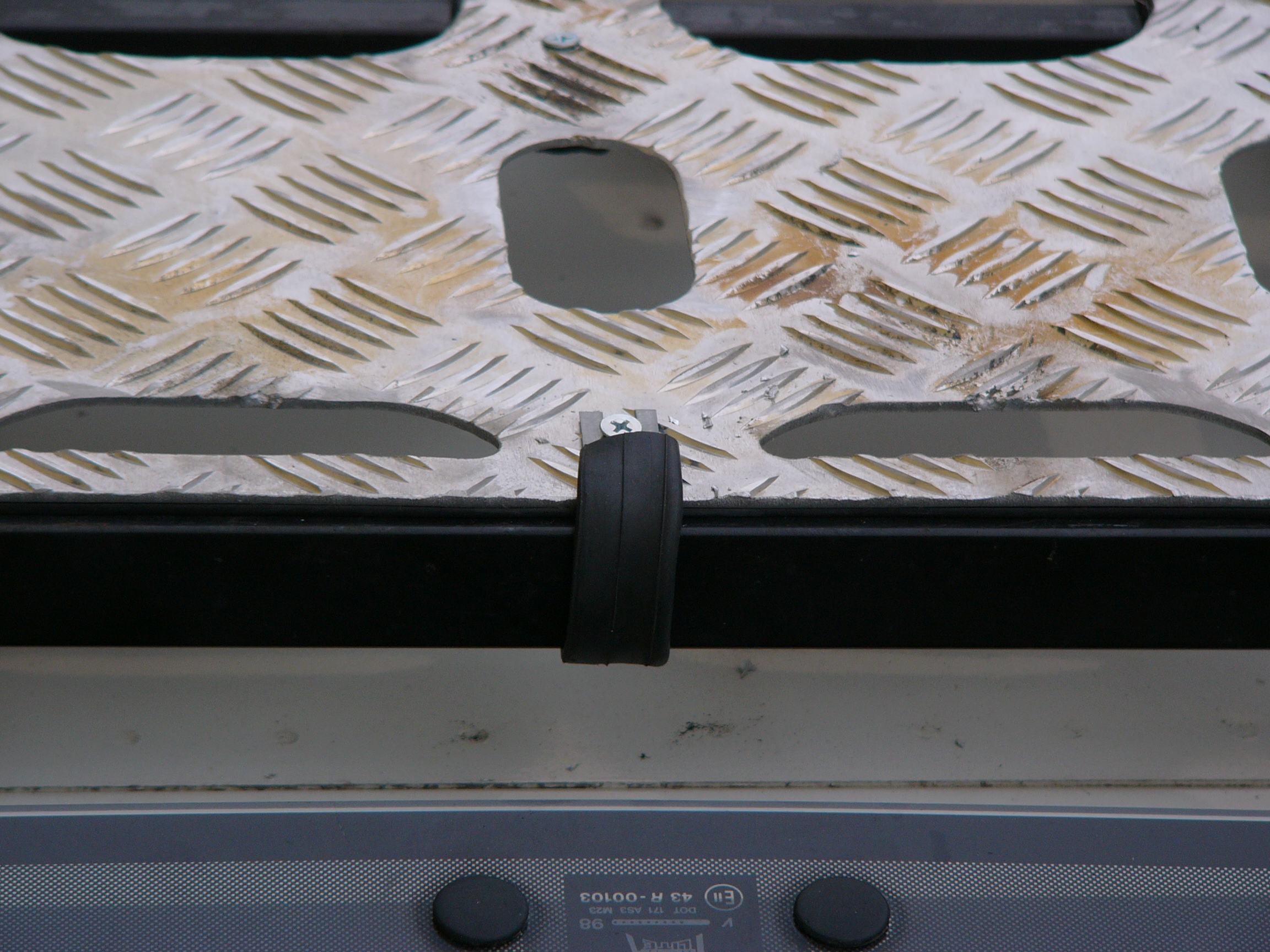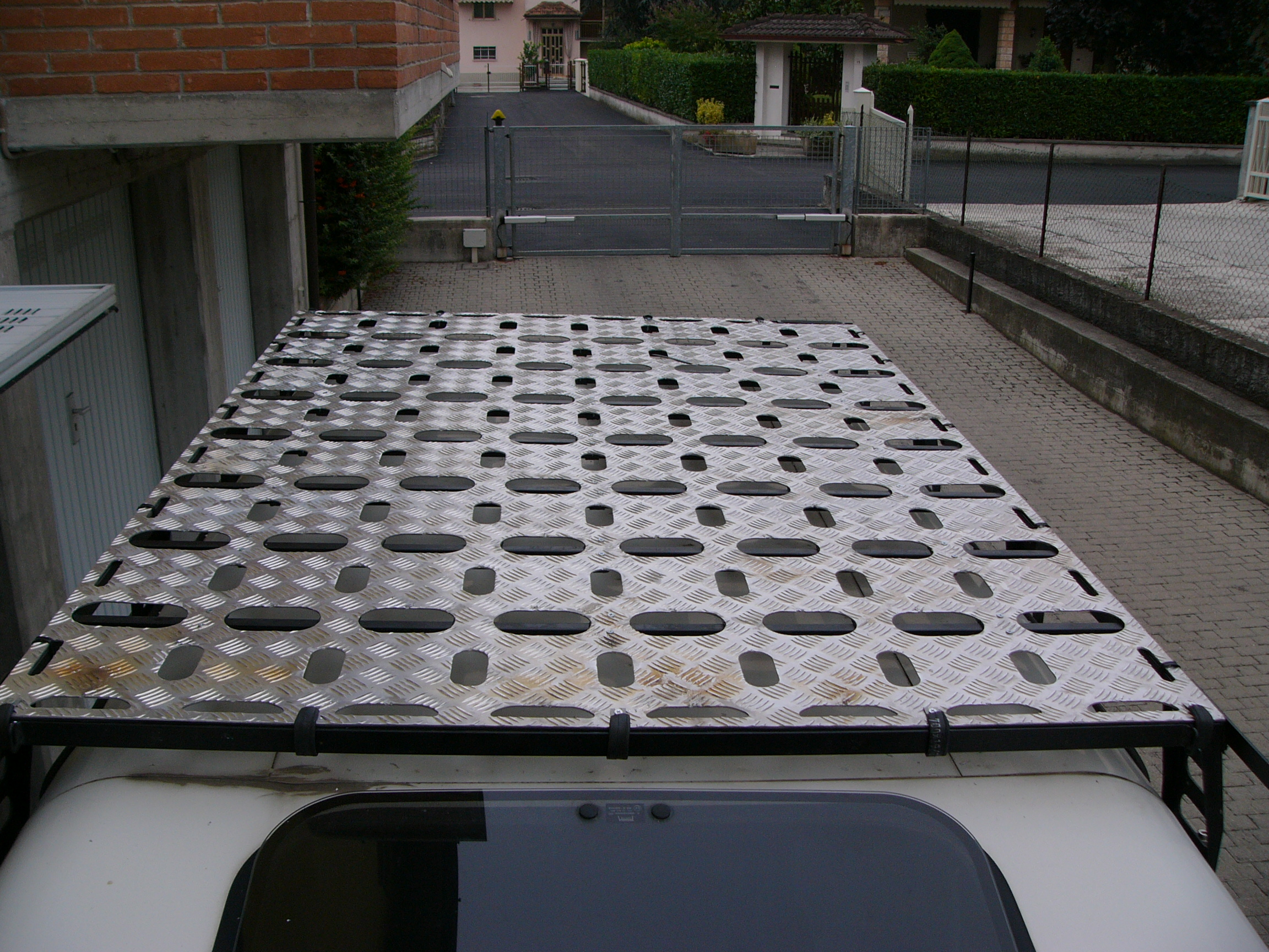 In nostro aiuto possiamo mettere un piano calpestabile, magari come ho fatto io in alluminio mandorlato antiscivolo, che permette di camminare sul portapacchi in tutta sicurezza e di poter fissare al meglio anche oggetti piccoli, non per ultimo mantiene ombreggiata l’auto durante i mesi estivi contribuendo a ridurre l’accumulo di calore esterno.
