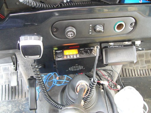 qui si vede il coperchio rimontato con il supporto per l’altoparlante esterno a destra e quello per il microfono a sinistra fissati sul cruscotto