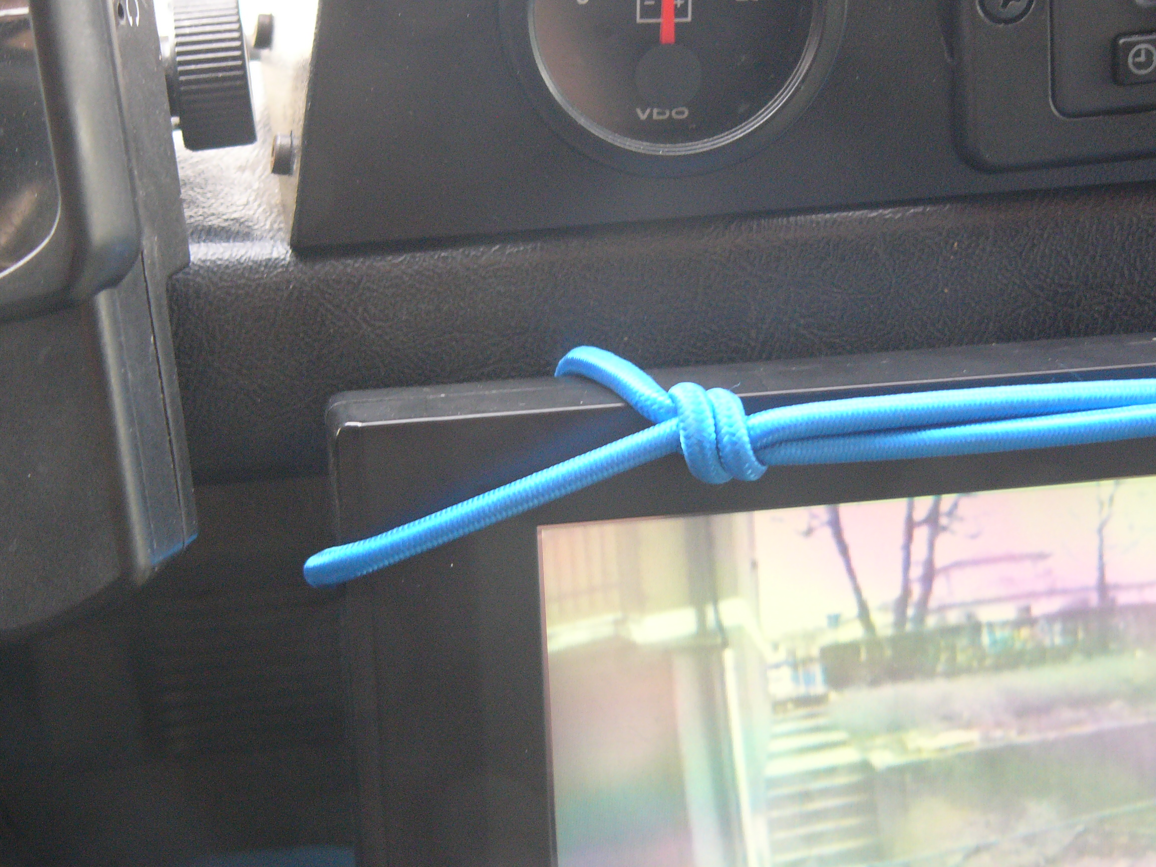 l’elastico ha la doppia funzione di trattenere il monitor e di evitargli eccessive vibrazioni (infatti si compone di due cavi elastici, uno trattiene il monitor sul fronte, l’altro si và ad interporre tra il monitor e il cruscotto)