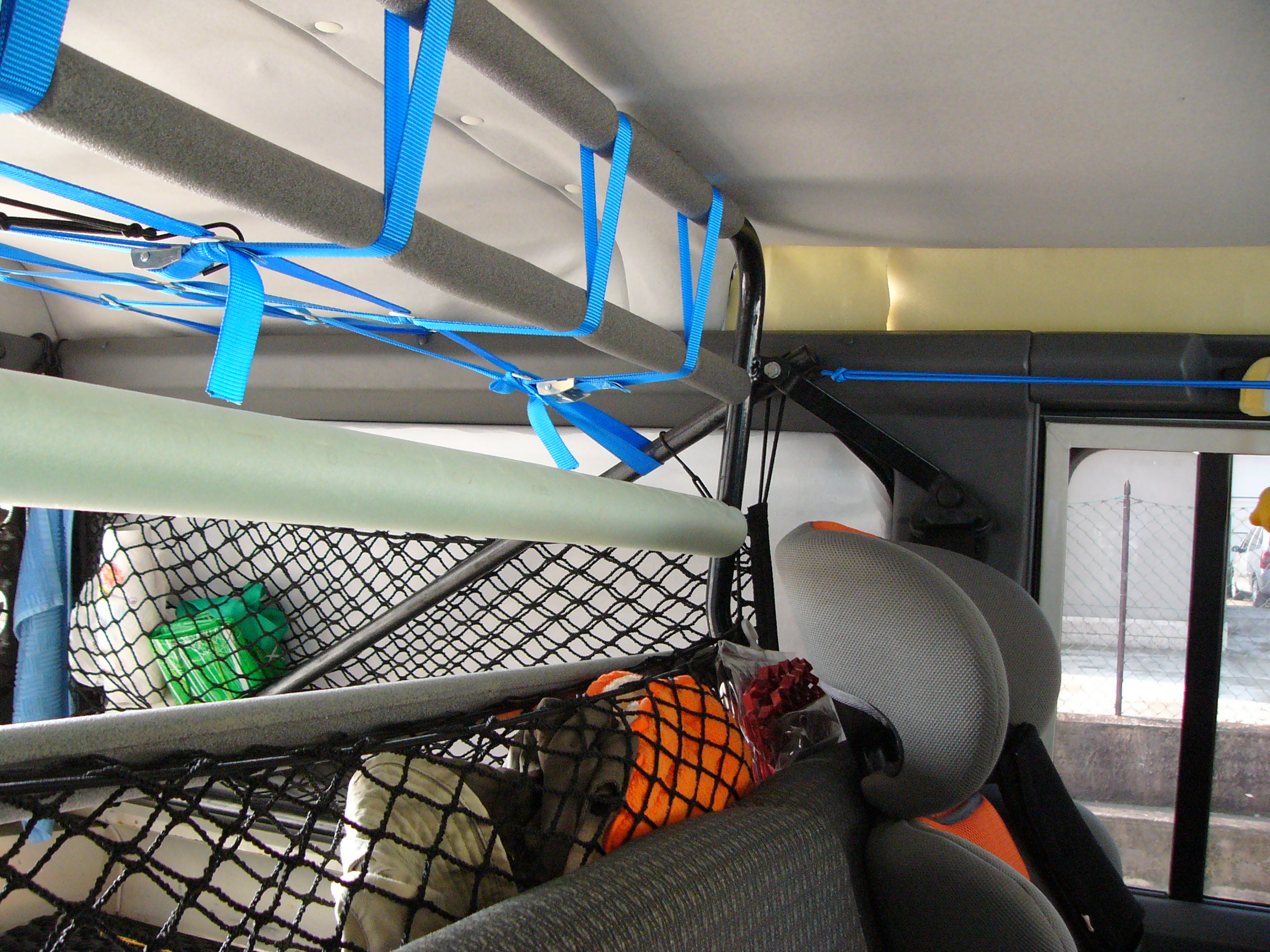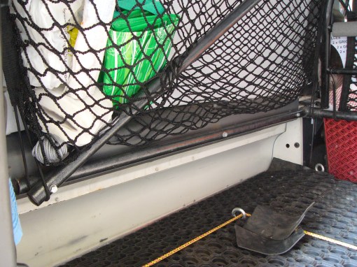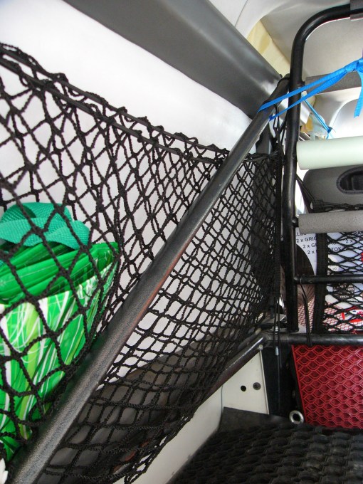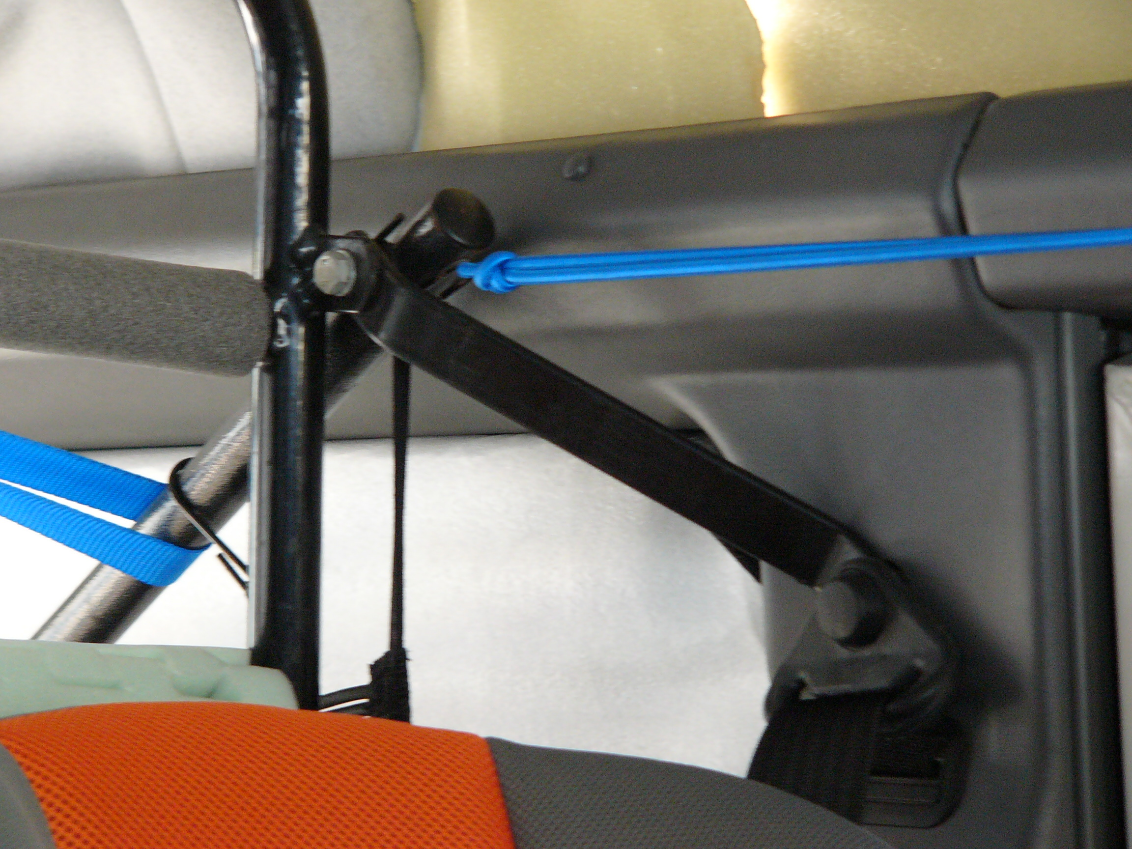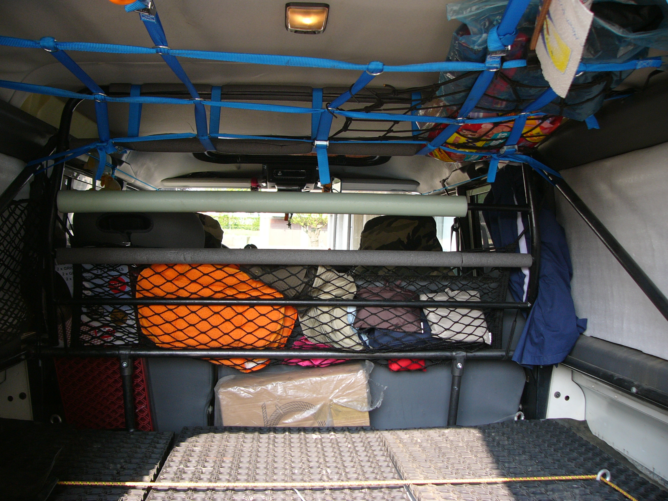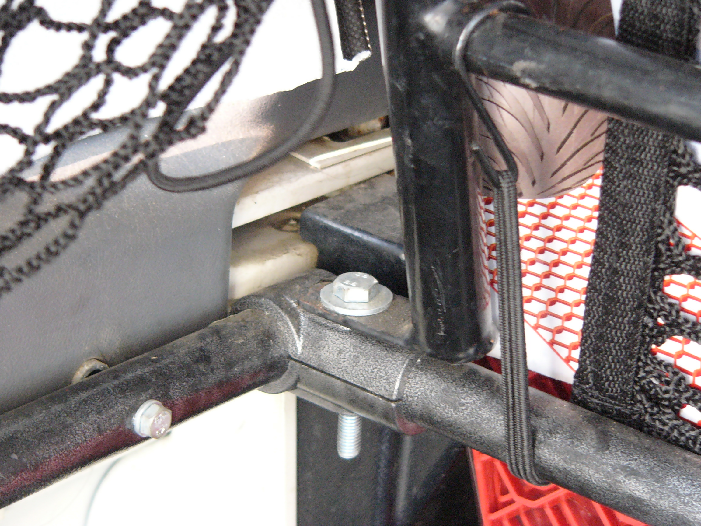 Per maggior sicurezza ho anche messo un tirante tra l’angolo superiore della griglia e l’estremità del tubo di longitudinale di sostegno, inoltre questo tubo mi protegge i finestrini e spesso mi è stato un utile punto di aggancio per fissare il carico