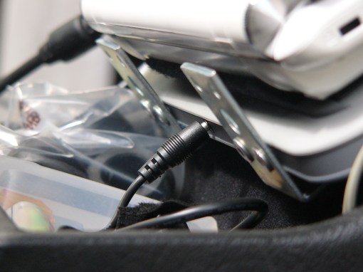 Volendo il pc è già utilizzabile così, il monitor aperto non dà fastidio nei cambi marcia e la batteria è sufficiente per una mezza giornata o più di viaggio, ma ovviamente per un uso “serio” occorre collegarlo alle varie periferiche: l’alimentazione, il cavo usb, il cavo vga per il monitor esterno, l’uscita per la presa AUX dell’autoradio, inoltre in caso di climi caldi si può alimentare anche il dissipatore di calore tramite il cavetto apposito