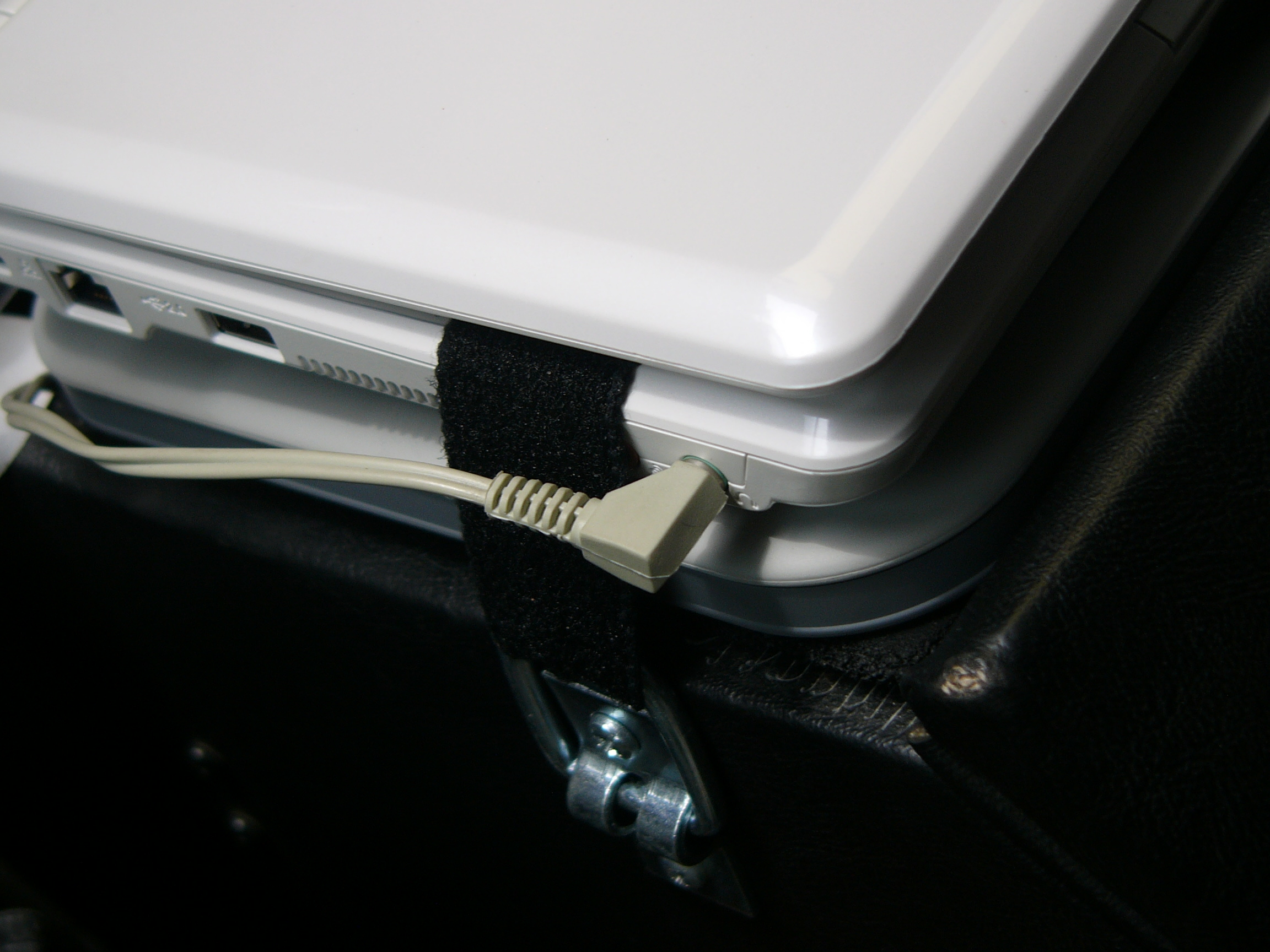 Volendo il pc è già utilizzabile così, il monitor aperto non dà fastidio nei cambi marcia e la batteria è sufficiente per una mezza giornata o più di viaggio, ma ovviamente per un uso “serio” occorre collegarlo alle varie periferiche: l’alimentazione, il cavo usb, il cavo vga per il monitor esterno, l’uscita per la presa AUX dell’autoradio, inoltre in caso di climi caldi si può alimentare anche il dissipatore di calore tramite il cavetto apposito