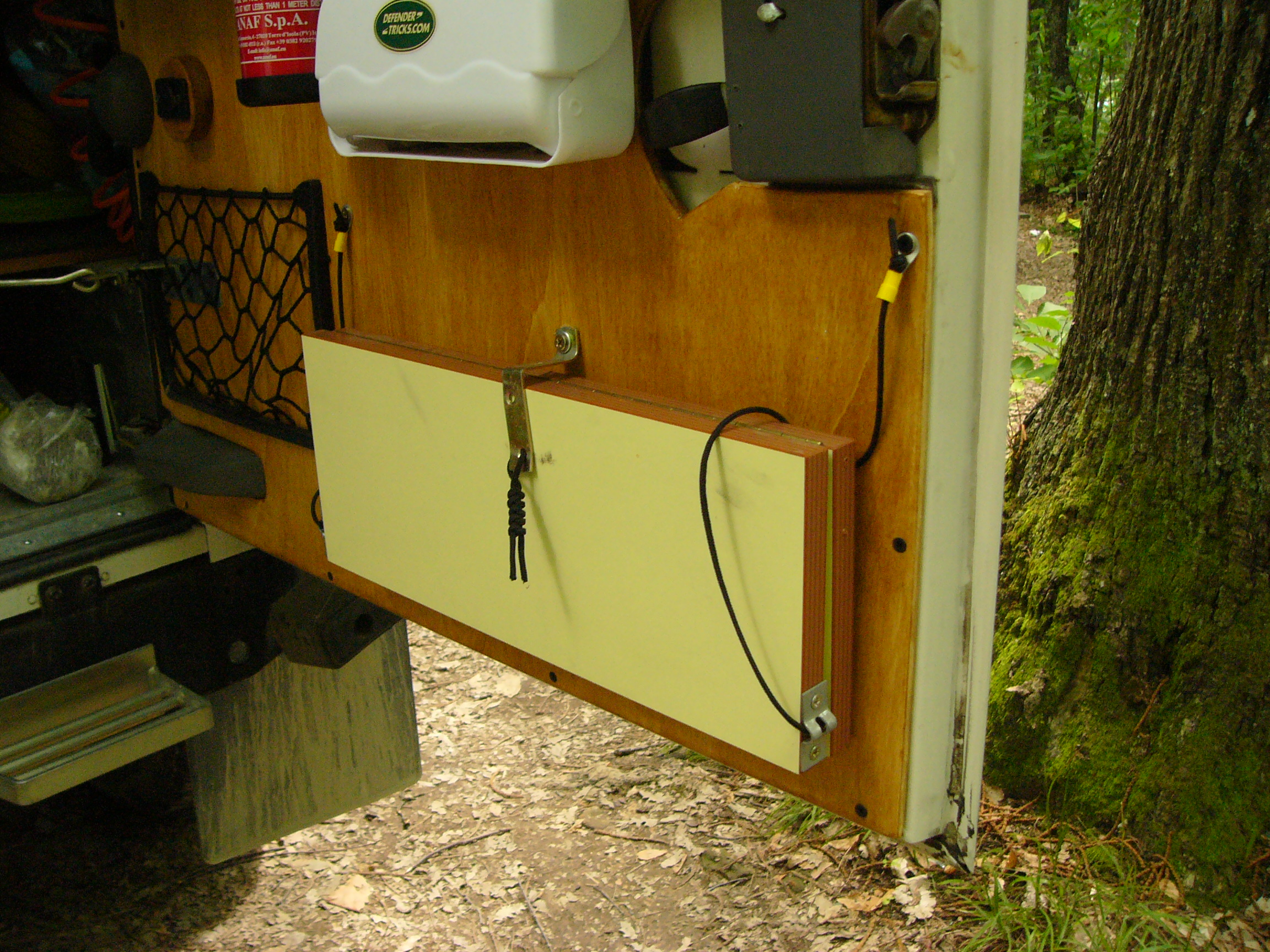Ho tagliato in sagoma una lastra di compensato da 8mm, rifinita, e messa sul il portellone fissandola con viti autofilettanti lungo la cornice dello stesso.