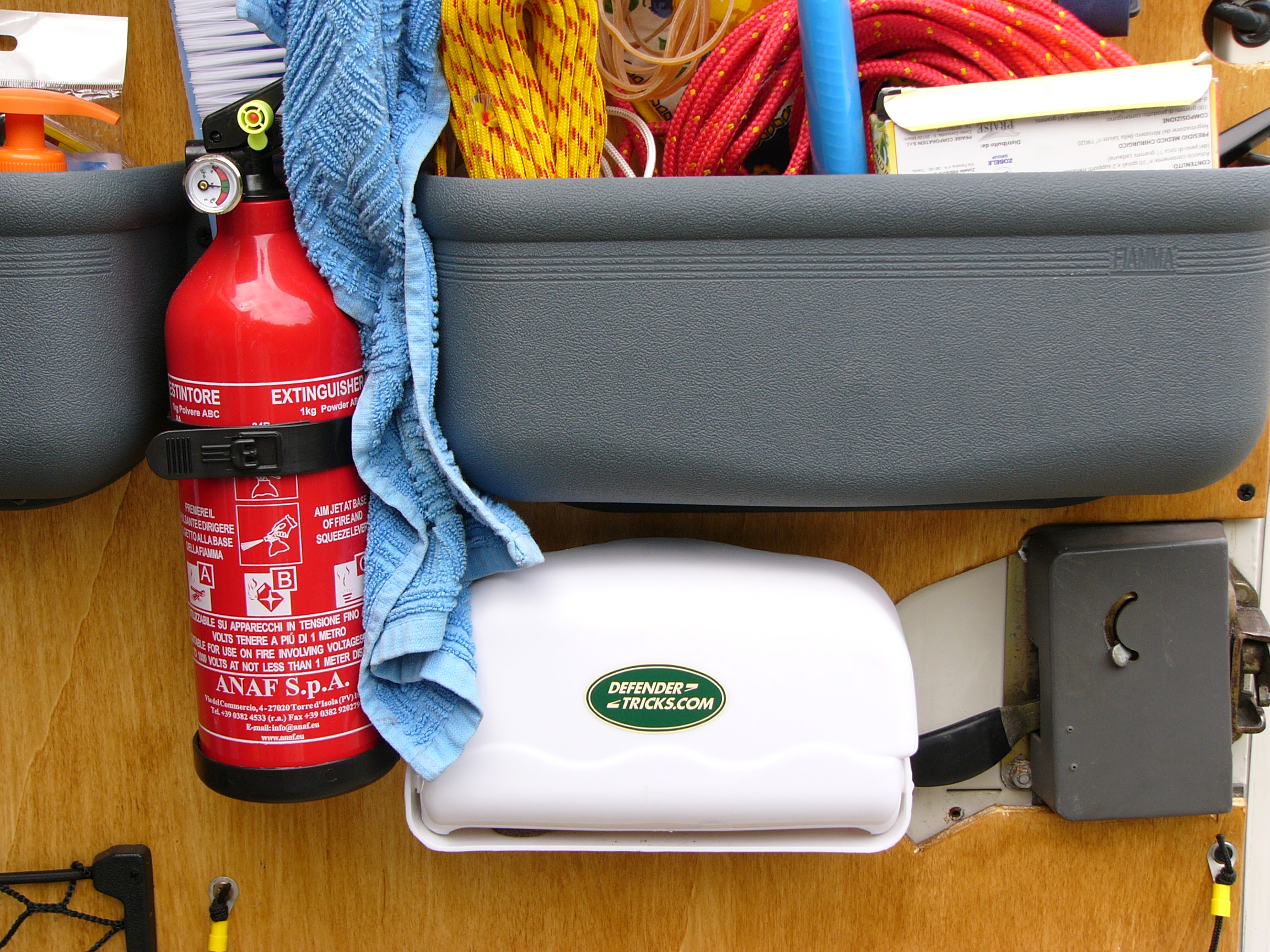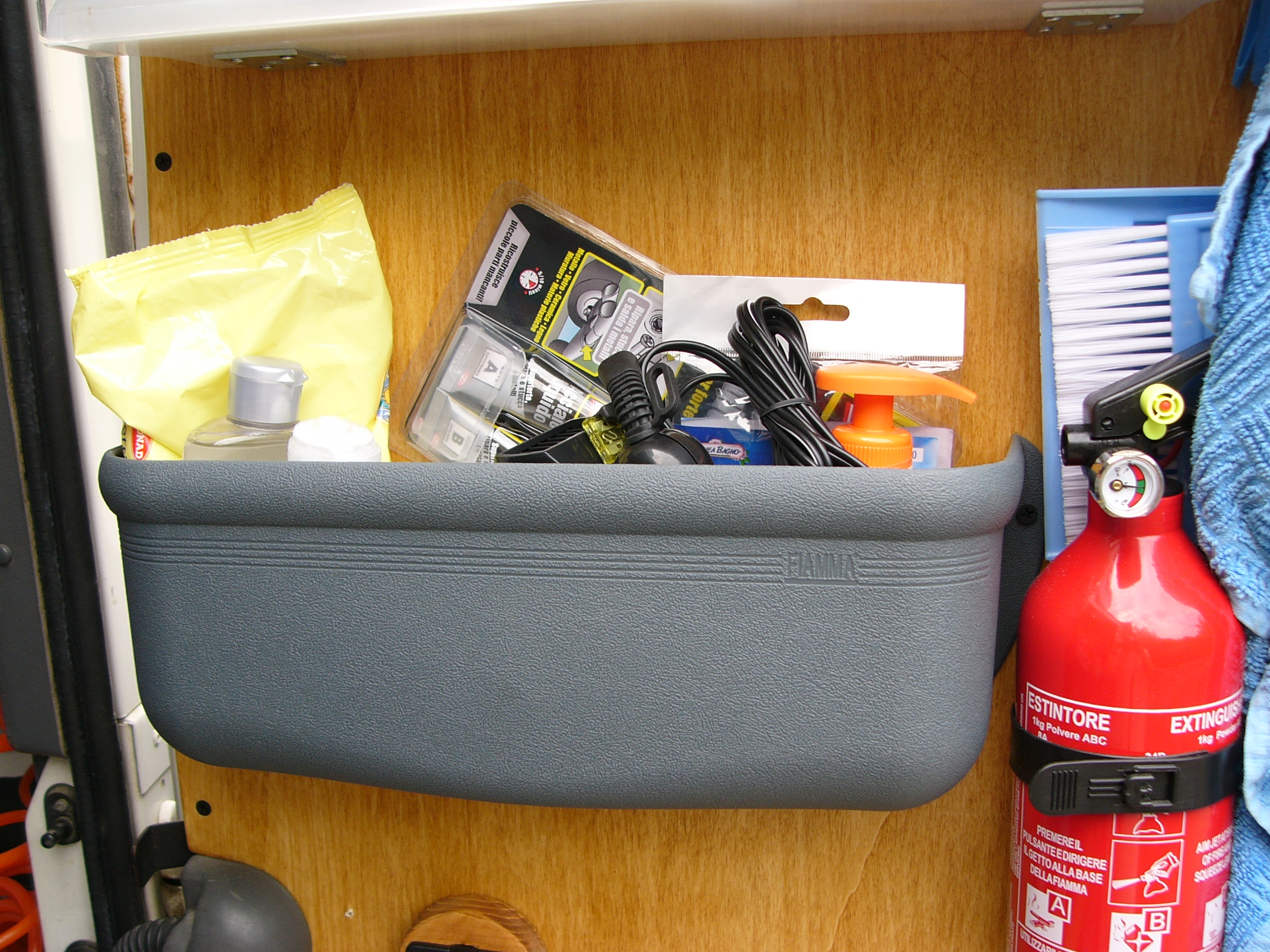 Nella parte centrale troviamo due capienti tasche della Fiamma di derivazione camperistica, tra le due un estintore da un kg, e sotto a quella di destra un contenitore con guanti da lavoro e straccio