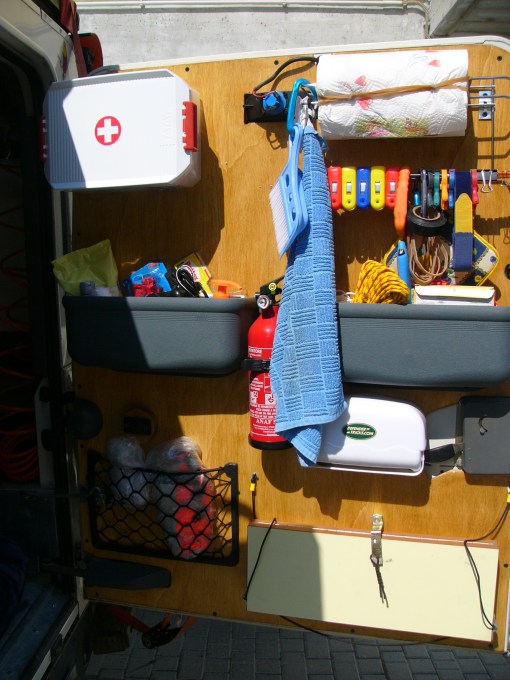 Sul compensato ho provveduto a fissare poi tutta una serie di portaoggetti e attrezzature che possono servire “al volo” durante il campeggio o una gita in fuoristrada.