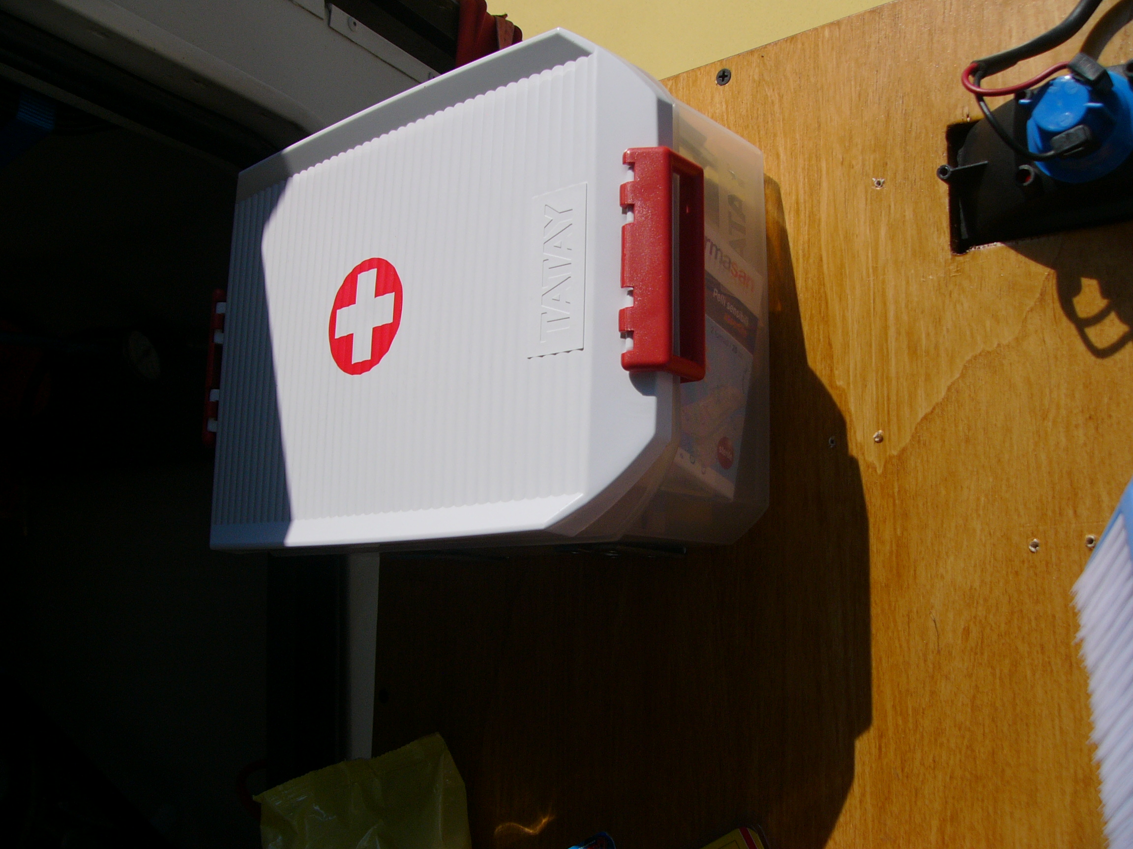 In alto a sx ho fissato una cassetta per il pronto soccorso con cerotti, garze, disinfettante e tutto quello che può servire per un primo soccorso veloce (in auto ho poi un kit di quelli già pronti, ma ho preferito una seconda cassetta con dentro quello che la mia esperienza riteneva più opportuno e di più facile ed immediato uso)