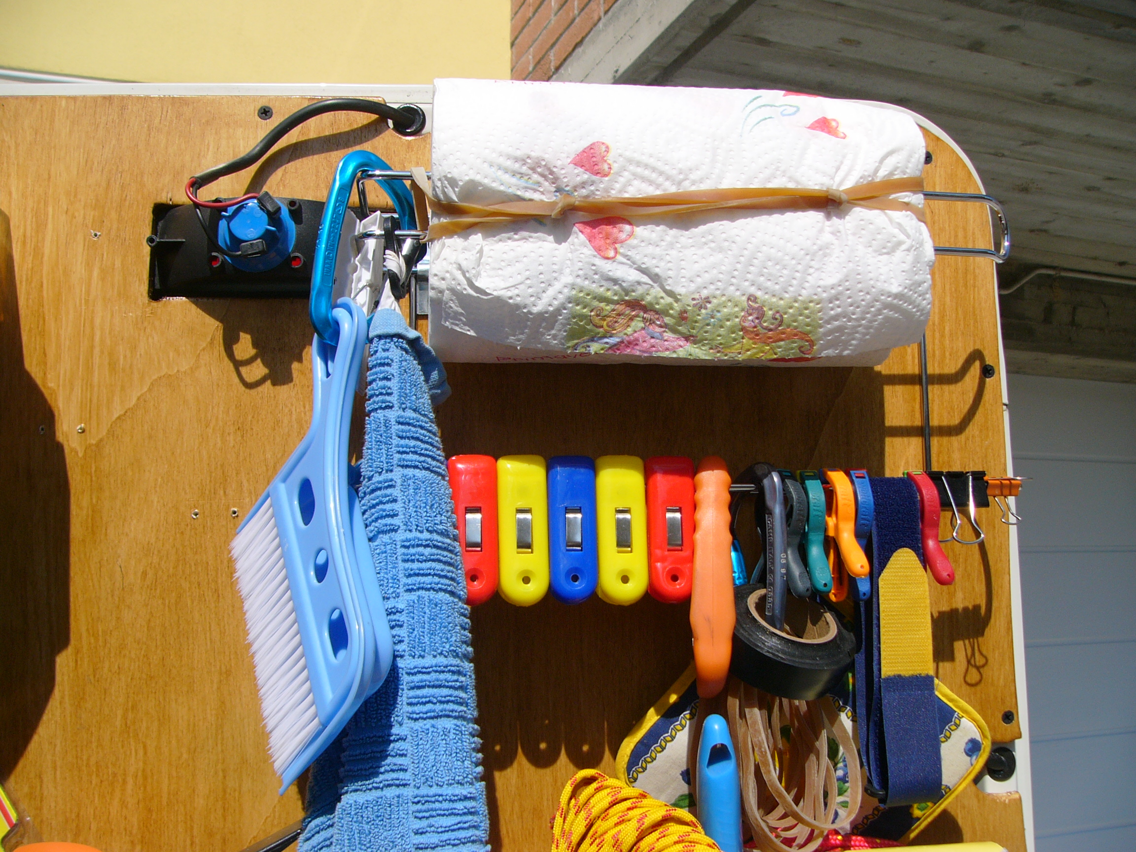 Sulla destra troviamo un portarotolo da cucina, il rotolo di carta è tenuto fermo da un elastico per evitare che si srotoli durante la marcia, sotto ho messo mollette, ganci, ecc.
