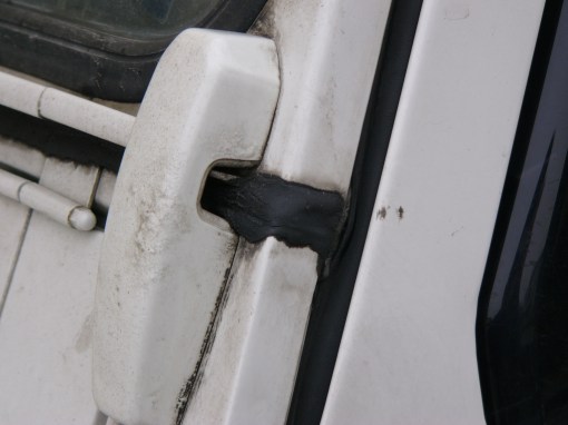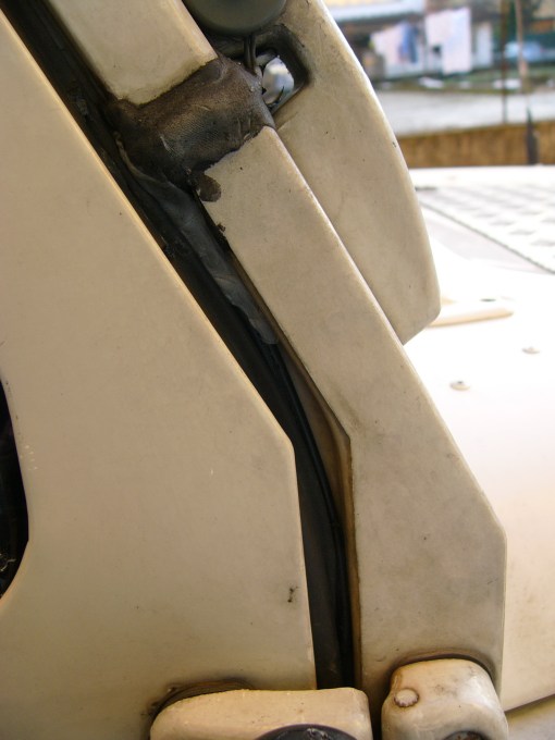 Qui si tratta di ricoprire di mastice in striscia la guarnizione spugnosa che corre tra il parabrezza e il parafiamma, prestando particolare attenzione vicino alle portiere altrimenti l’acqua sgocciola dentro, scende lungo la guarnizione della portiera e quando incontra il tirantino della stessa entra in abitacolo e vi gocciola sul piede.