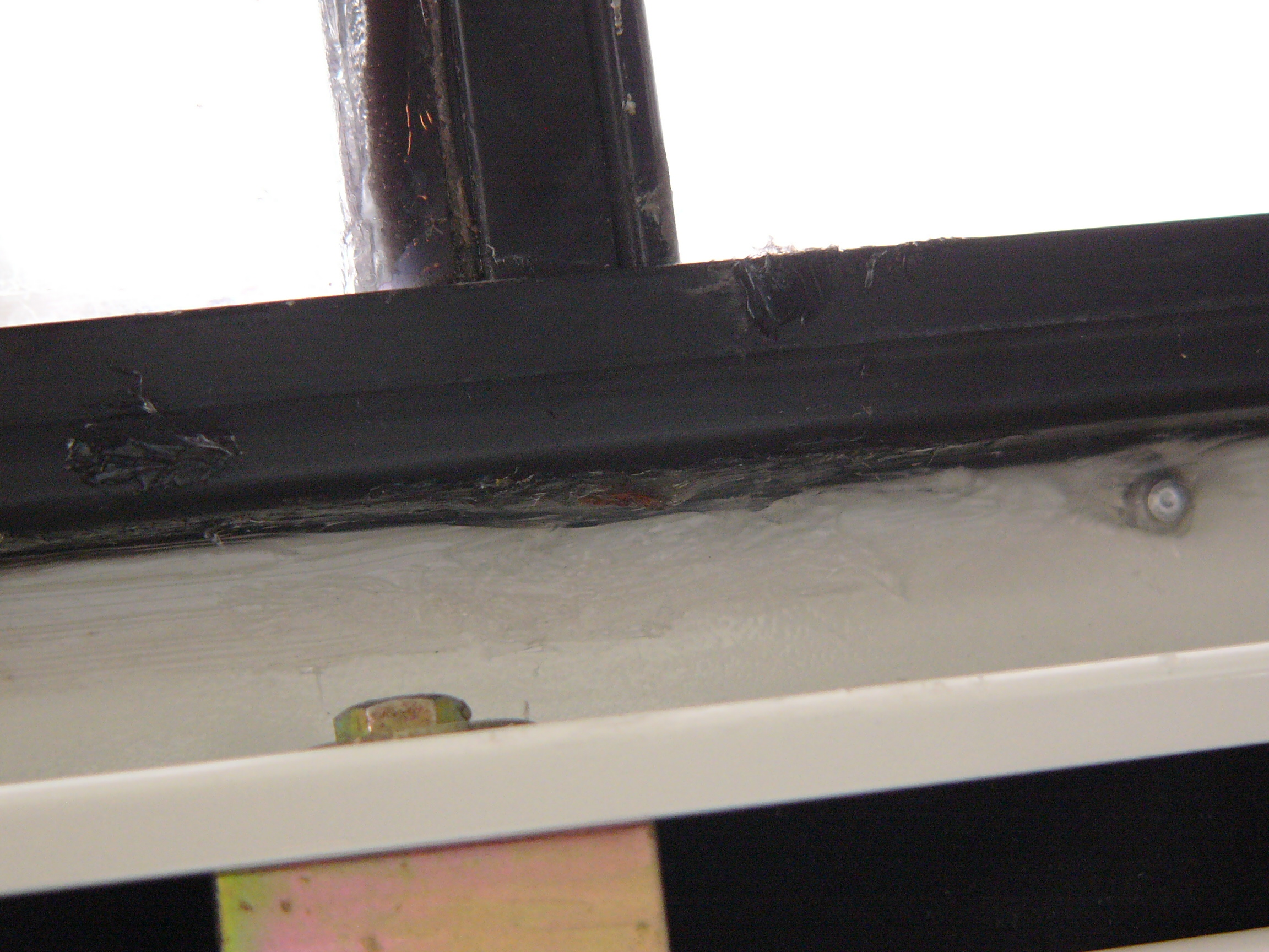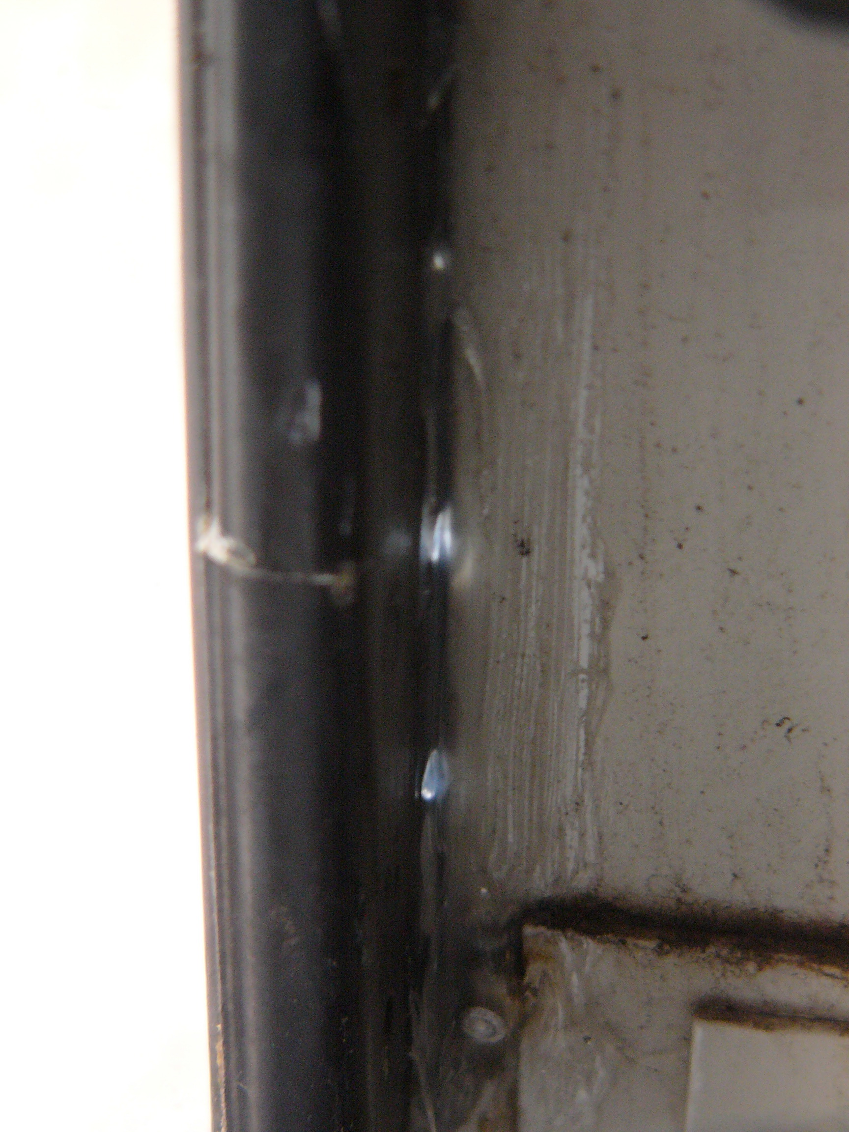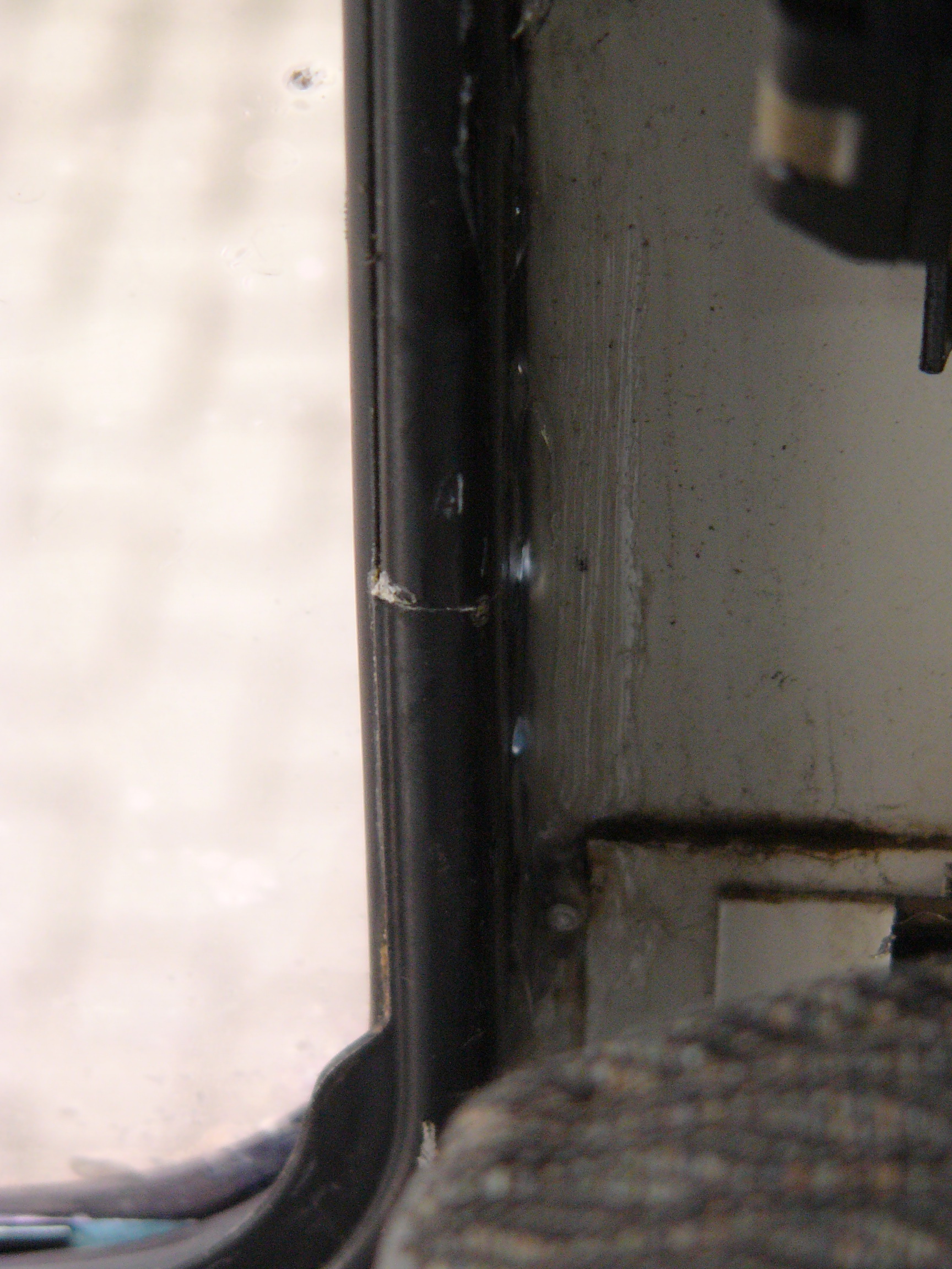 e soprattutto da tre fori (!!) che ci sono sul lato verticale anteriore del telaio del vetro, qui li vedete già siliconati ma la luce che traspare fà capire la dimensione degli stessi (notare che i tre fori ci sono speculari su entrambi i finestrini, segno che non si tratta di un difetto di montaggio ma di progettazione!)