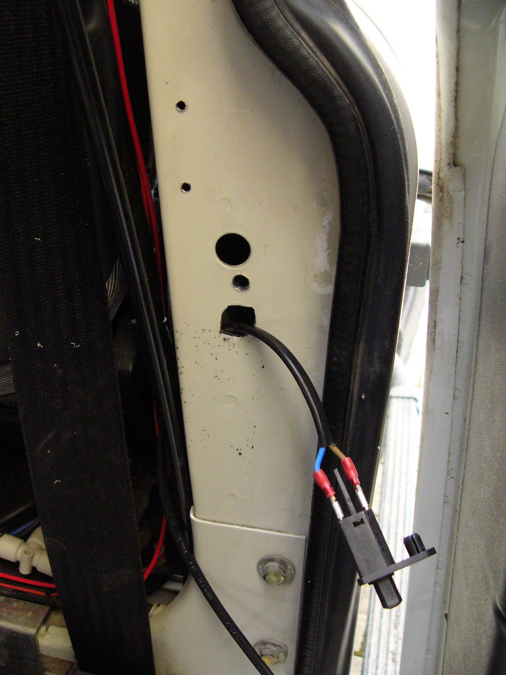 Si ripete sull’altro lato e si tirano i fili…. questi pulsanti sono isolati, quindi non come i pulsanti di serie che vanno già a massa di suo, gli và quindi tirata una massa, messi in serie quello sul piantone destro con quello sul piantone sinistro, e da lì andare a collegarsi col cavo proveniente dai pulsanti anteriori (il cavo viola/blu che sale lungo il montante anteriore sinistro).