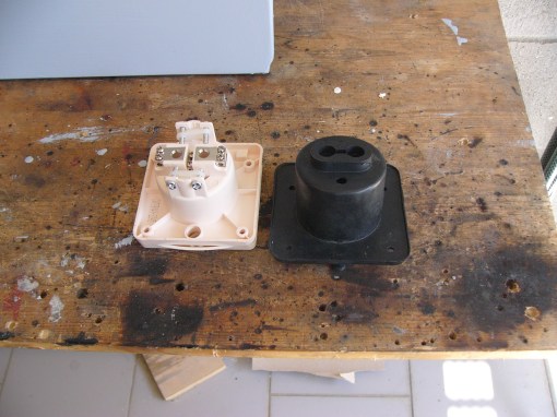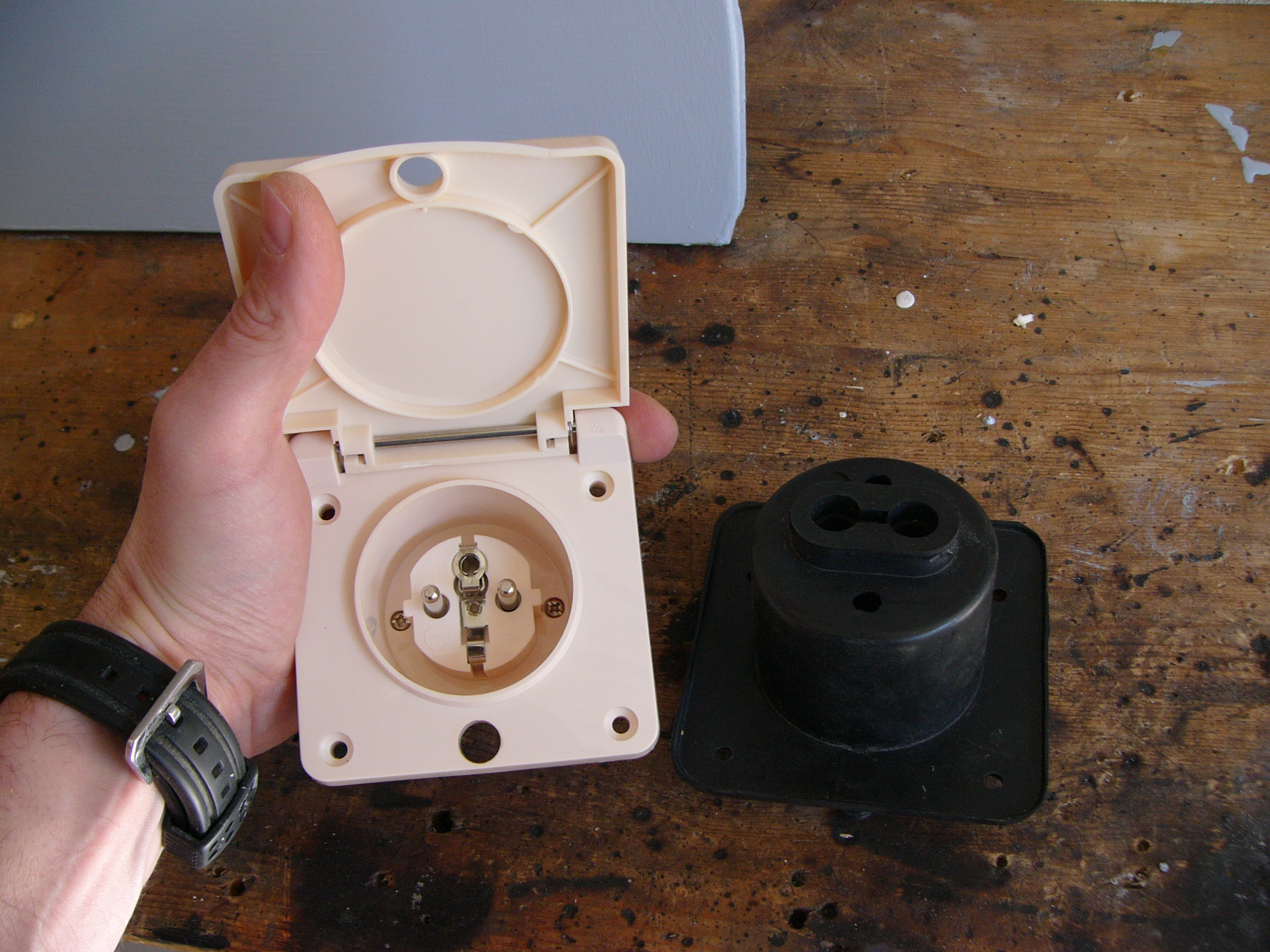 Al contrario di Poggio non ho utilizzato una spina a norme CE ma una vecchia Schuko, disponibile come ricambio per camper datati essendo ormai obbligatoria sui nuovi mezzi quella CE, perchè ha il vantaggio di essere meno ingombrante e di necessitare di un foro più piccolo