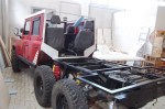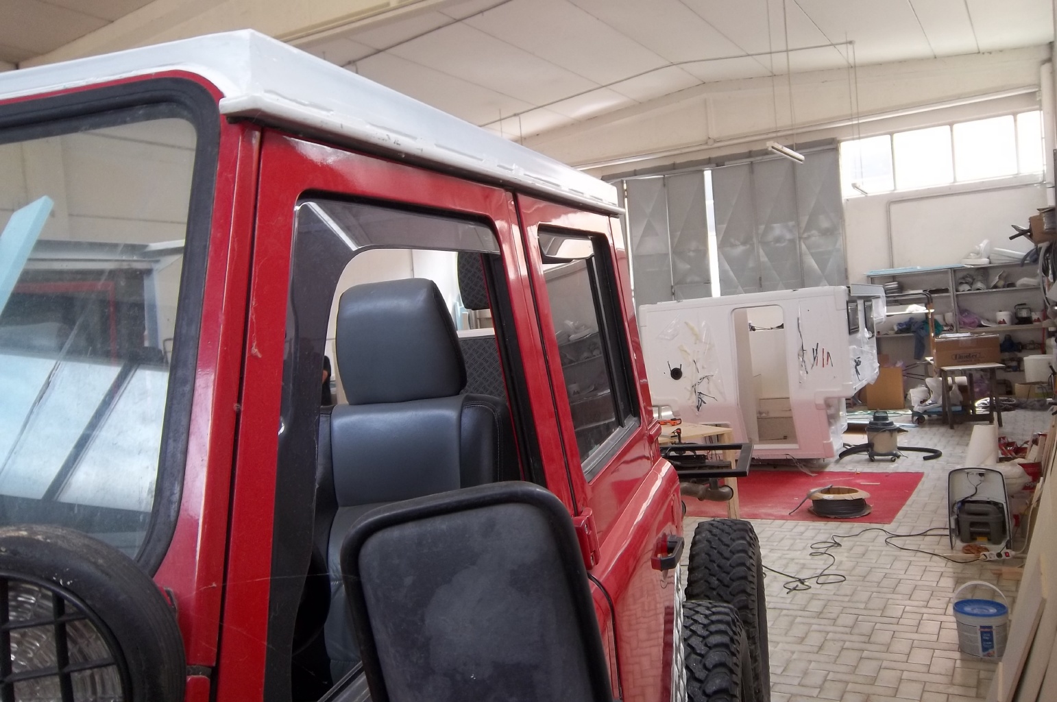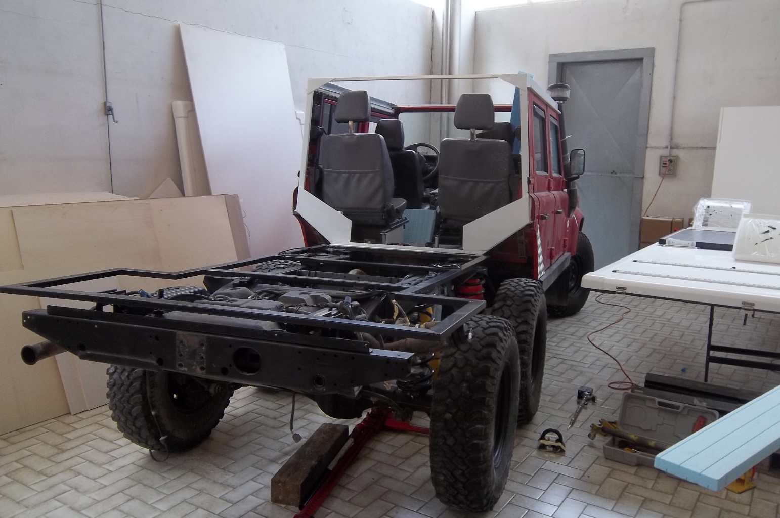 Sul 110 è stato montato il telaio su cui andrà a fissarsi la cellula ed è stato predisposto il tetto per ricevere la parte mansardata, inoltre è stato predisposto un telaio di rinforzo dietro i sedili posteriori che sorregga il tutto e dia robustezza alla carrozzeria.